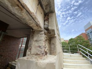 A doorway opening over the northeast lower-level entrance of the Broughton Hall and NC State University has experienced significant deterioration of concrete structural members. NCSU requested Atlas Engineering to provide design services for permanent repairs.