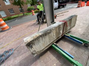 During the construction, Atlas Engineering came out to the site several times. During the demolition, it was discovered that the main steel shelf angle and original reinforcement were completely deteriorated. Contractor , IQ Contracting, was able to follow the design and salvage limestone fascia blocks successfully.